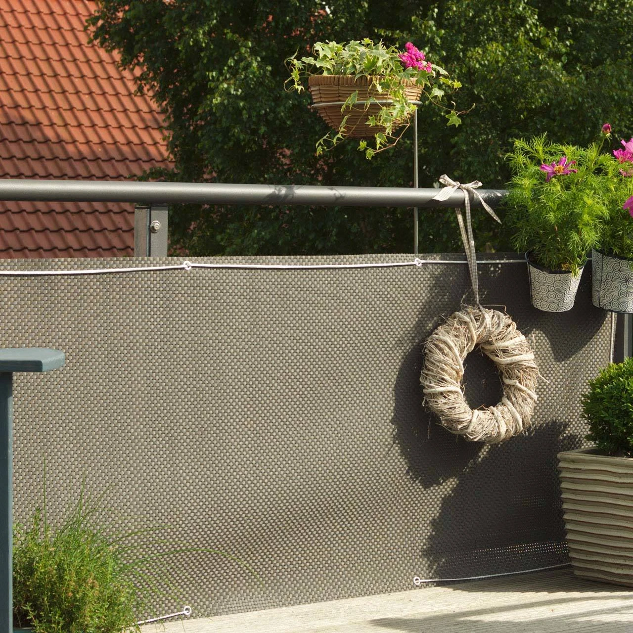 Schaffen Sie sich ein gemĂŒtliches Ambiente und eine dekorative Sitzecke mit dem Balkonbespannung. Sie schĂŒtzt Sie und Ihre Familie sowohl vor WitterungseinflĂŒssen als auch vor neugierigen Blicken der Nachbarn. Durch handliche Metallösen können Sie die Bespannung ganz einfach am Balkongitter anbringen. Achten Sie darauf, dass Sie sie etwa 10 cm ĂŒber dem Boden anbringen, um StaunĂ€sse zu vermeiden und so möglichst lange Freude daran zu haben.