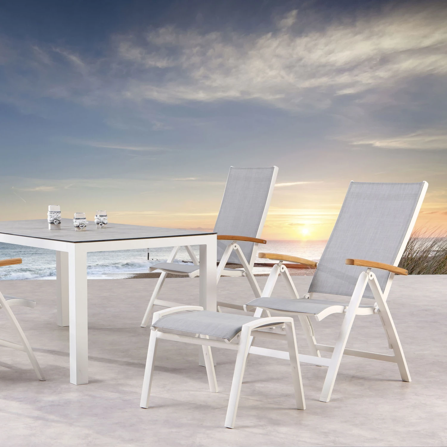 Mit dem Klappsessel Cavalese / weiss m. Teakarmlehnen trifft Einfachheit auf Komfort: Ein schlicht-filigranes Design aus Alumium, Ergotex-Gewebe und Armlehnen aus Teakholz machen dieses Möbelstück zu einem treuen Begleiter im Sommer. Schnell und einfach zusammengeklappt lässt er sich nicht nur wunderbar verstauen, sondern auch transportieren. Für die Reinigung wird lediglich ein sauberes Tuch, eine Bürste und ein wenig Wasser mit Spülmittel bzw. Seifenlauge benötigt. Die Sitzbezüge können kinderleicht abgenommen und gewaschen werden. Obwohl dieser Klappsessel ganzjährig im Garten oder im Haus genutzt werden kann, kann er für eine längere Lebensdauer zum Überwintern in eine atmungsaktive Folie gepackt werden. Dank der hohen Materialqualität haben Sie aber ohnehin lange Zeit Freude an diesem Sessel.