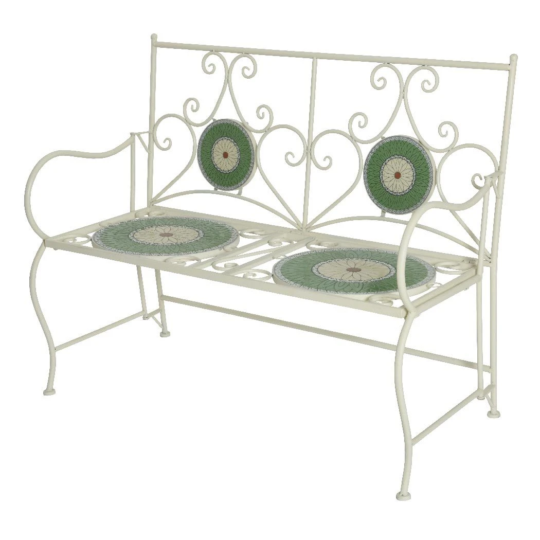 Mit dieser geschmackvollen Klappbank bekommt Ihre Outdoor-Sitzlandschaft eine mediterrane Nuance. Der komfortable Zweisitzer ‚Vigo‘ ist aus stabilem, langlebigem Eisen gefertigt und mit farbenfrohem Blumenmosaik aufwendig verziert. Denken Sie daran, dass diese Gartenmöbel nicht frostfest sind. Bei Nichtbedarf lässt sich die Mosaik-Sitzbank platzsparend aufräumen.