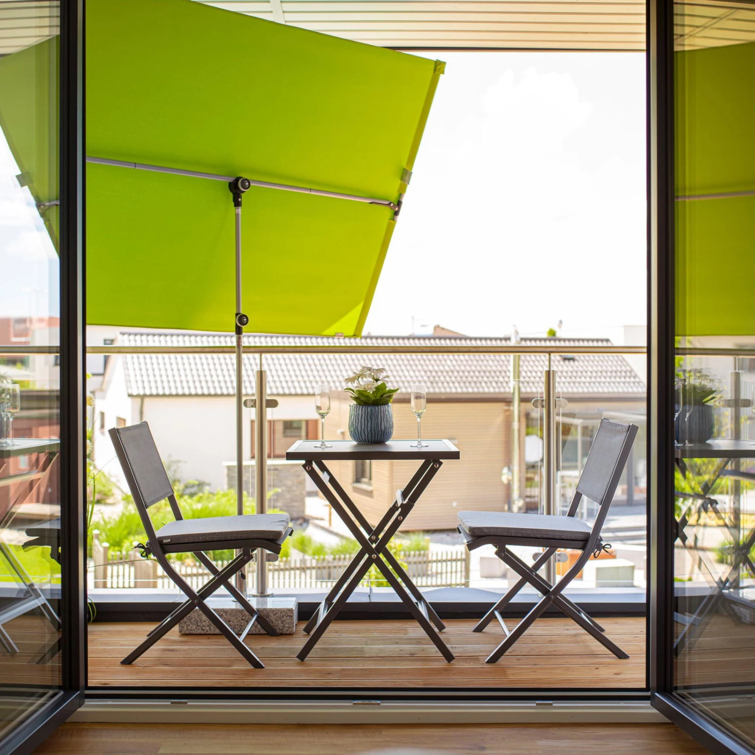 Mit diesem praktischen Möbelset von Doppler verwandeln Sie sogar einen kleinen Balkon in eine Komfortoase. Der Tisch mit robuster Glaskeramikplatte und die Sitzmöbel mit Alugestell sind pflegeleicht und witterungsbestĂ€ndig. Das Balkon-Möbelset ‚Expert‘ nimmt nicht nur wenig Platz ein, sondern lĂ€sst sich auch mit wenigen Handgriffen zusammenklappen.