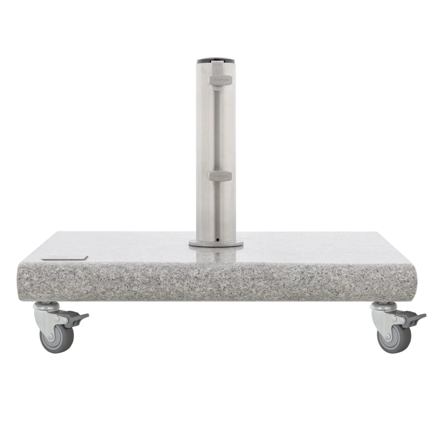 Mit diesem rund 40 Kilogramm schweren Sockel aus Naturmaterial Granit bleibt Ihr Sonnenschirm von Knirps standhaft. Denken Sie jedoch daran, bei stĂŒrmischem Wind den Sonnenschirm unbedingt rechtzeitig zu schlieĂen. Ihr Vorteil: Der Granitsockel ist mit Rollen ausgestattet, um Ihre Beschattung mit maximaler FlexibilitĂ€t zu gestalten.