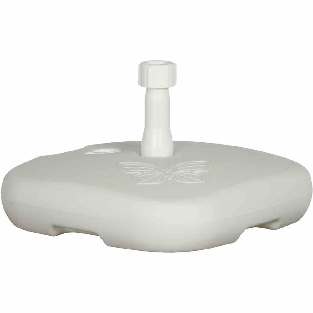Dieser Schirmständer ist perfekt geeignet für alle kleineren Sonnenschirme, die einen Durchmesser von 2 m nicht überschreiten. Des Weiteren ist der Schirmständer für einen Rohrdurchmesser von 18-32 mm geeignet. Dieser Schirmfuß aus weißem Kunststoff kann wahlweise mit Wasser oder mit Sand befüllt werden. Die Füllmenge für Wasser sollte bei 16 l liegen, die Füllmenge für Sand sollte 26 kg betragen. So ist es auch noch möglich, den Sonnenschirm zwischendurch an einem anderen Platz aufzustellen. Die relativ geringe Füllmenge lässt einen Standortwechsel durchaus zu. Dieser Schirmfuß ist UV-stabilisiert und lichtecht. Ein sicherer Halt für Sonnenschirme ist sehr wichtig. Eine solche Standsicherheit wird durch diesen Schirmständer gewährleistet. Mit dem perfekten Schirmfuß wird etwaigen Beschädigungen des. Gartenschirms vorgebeugt, denn ein leichtes Umstürzen des Sonnenschirms wird durch den befüllten Schirmfuß schon im Vorfeld verhindert.