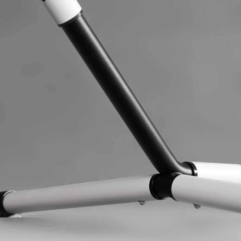 Das Gestell besteht aus pulverbeschichtetem Stahl, ist höhenverstellbar und bis zu 120 kg belastbar.