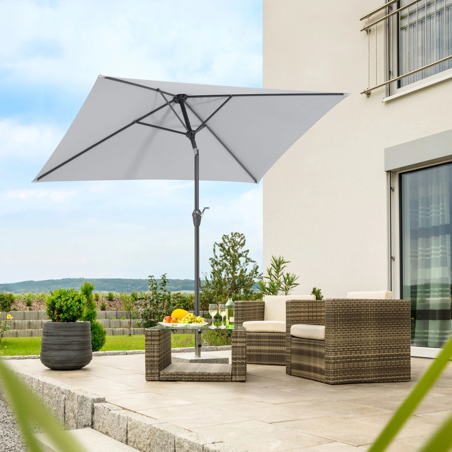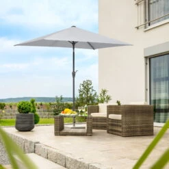 Der rechteckige Sonnenschirm BILBAO von Schneider spendet Ihnen sicher und zuverlĂ€ssig Schatten. Dieser Schirm prĂ€sentiert sich in einer neutralen farbe und ĂŒberzeugt durch eine hochwertige Bespannung aus wasserabweisendem und verrottungsfestem Polyester. Achten Sie allerdings darauf, das empfohlene Sockelgewicht von 40 Kilogramm nicht zu unterschreiten.