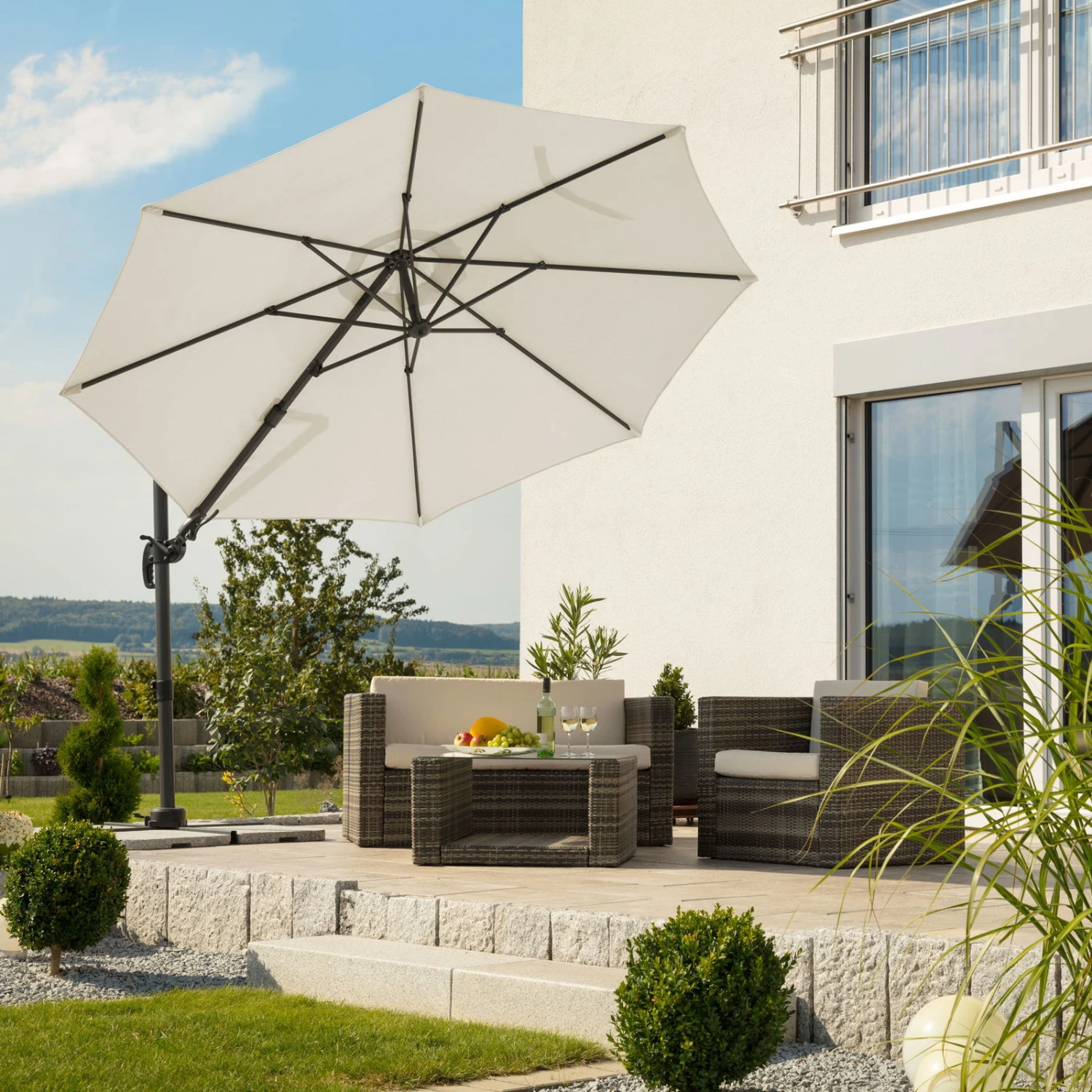 Sie können diesen hochwertigen Ampelschirm mit nur wenigen Handgriffen durch das Drehen, Neigen und Koppen vom Frühmorgen bis Spätabend an den Sonnenstand anpassen. Der runde Sonnenschirm ‚Rhodos eco TWIST‘ von Schneider Schirme ist eine flexible Lösung, wenn es um schattig-kühle Oasen im Garten oder auf der Terrasse geht.
