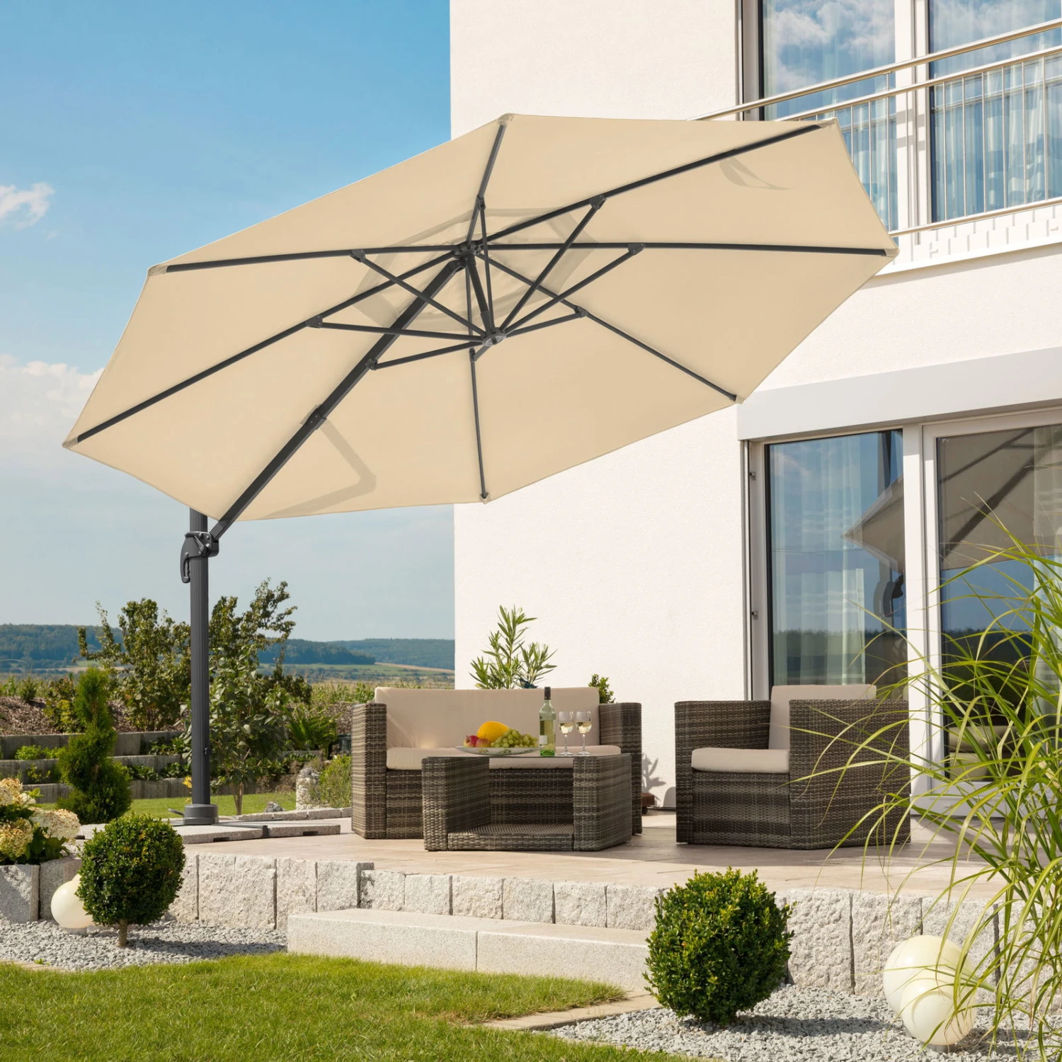 Der runde Pendelschirm Rhodos Grande von Schneider ist ein großzügig dimensionierter Schattenspender, der sich in jeden Gartenstil harmonisch einfügt. Mit nur ein paar Handgriffen passen Sie die Position des Ampelschirms dem Sonnenstand exakt an. Zu den Pluspunkten von diesem Sonnenschirm gehört eine pflegeleichte, wasserabweisende und lichtechte Bespannung.