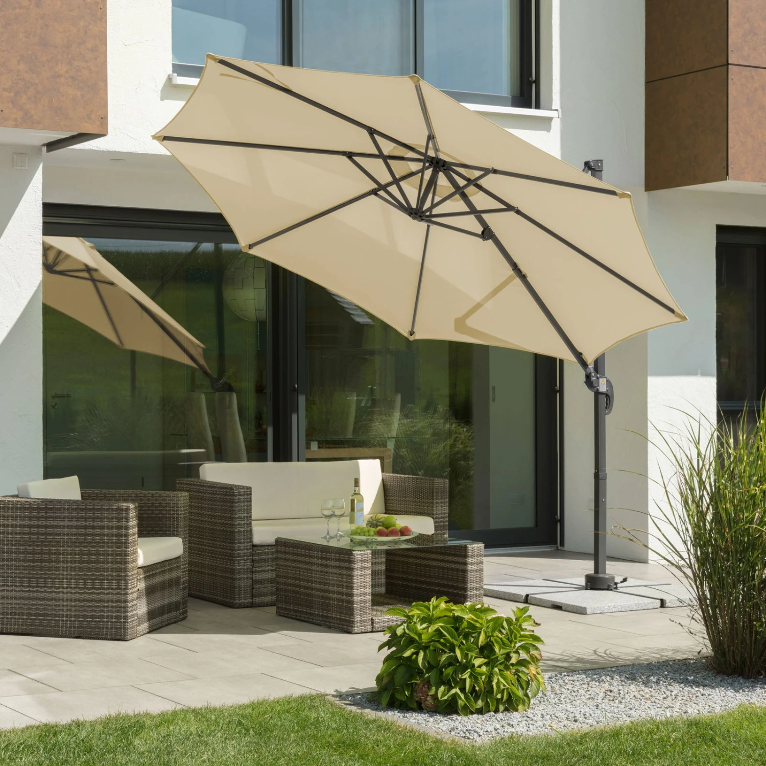 Der runde Ampelschirm Rhodos Junior von Schneider ist ein komfortabler und sicherer Sonnenschutz für glühend heiße Tage. Es genügen wenige Handgriffe, um den Pendelschirm Rhodos Junior exakt an den Sonnenstand anzupassen. Ein weiterer Vorteil des Modells ist die pflegeleichte und langlebige Bespannung aus Polyester.