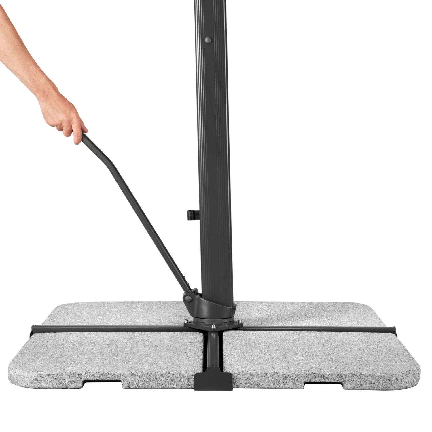 Dieser Pendelschirm ĂŒberzeugt durch sein intelligentes Design und ist mit wenigen Handgriffen an den aktuellen Sonnenstand angepasst. Sie erhalten den Ampelschirm ‚Rhodos Smart‘ von Schneider Schirme inklusive eines praktischen StĂ€nders, zusĂ€tzlich benötigen Sie Wegeplatten 50 x 50 cm. Der wasserabweisende, lichtechte Bezug lĂ€sst sich zur Reinigung problemlos abnehmen.