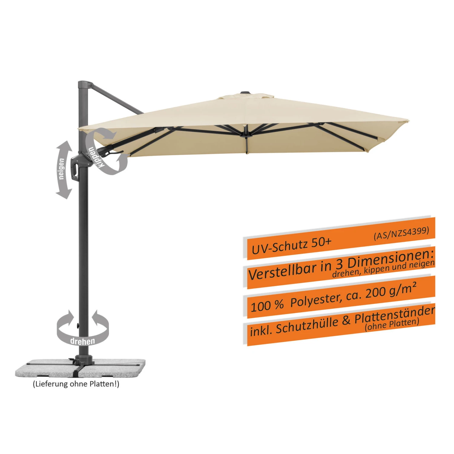 Wenn Sie nach einem groĂzĂŒgig dimensionieren und flexiblen Schattenspender suchen, dann ist der Sonnenschirm ‚Rhodos Twist‘ von Schneider-Schirme die richtige Wahl fĂŒr Sie. Dieser Ampelschirm lĂ€sst sich mit wenigen Handgriffen in drei Dimensionen verstellen, sodass Sie zu jeder Tageszeit optimal von der Sonne geschĂŒtzt bleiben. AuĂerdem profitieren Sie von einem verrottungsfesten und wasserabweisenden Polyesterbezug.